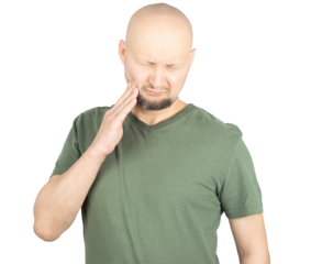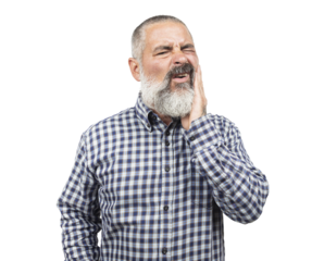 Mature man with beard suffering from terrible toothache, touching cheek, isolated on white background