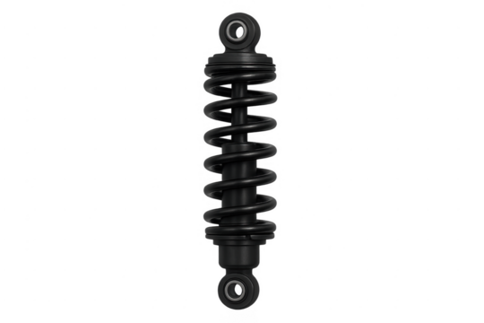 Close up of a black coil spring shock absorber isolated on transparent background, showcasing automotive suspension system and damping mechanism