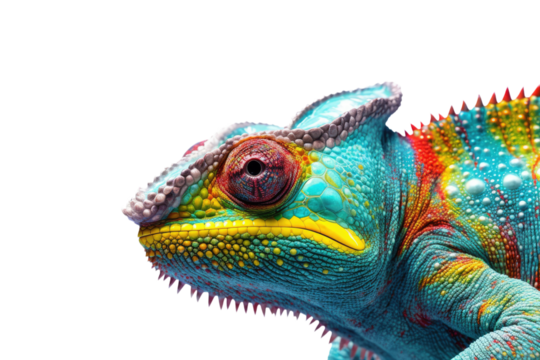Abstract of lizard chameleon portrait isolated on white background with multi colored colorful on skin body and scales paint, reptile animal, Vibrant bright, with Generative AI.