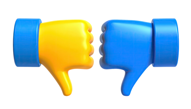 Blue neon thumbs up and thumbs down icons isolated on transparent background