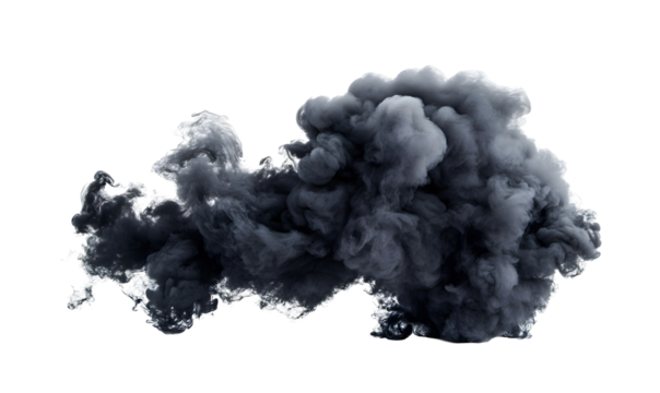 Black smoke explosion placed on empty white or transparent background. Isolated abstract brush