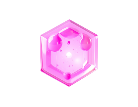 A glowing, pink hexagonal jewel with internal liquid droplets against black