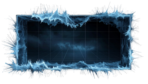 A dark circular graphic with a blue grid pattern and a central hole, featuring two small light blue markers, resembling a digital interface or futuristic radar display. background removed