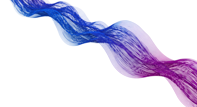 Intricate abstract wave of ultra-thin blue to purple lines on transparent, elevated view, copy space, concept of digital data flow and tech advancement