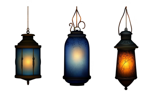3D Render of Three Illuminated Lanterns in Gold Blue and Orange Colors