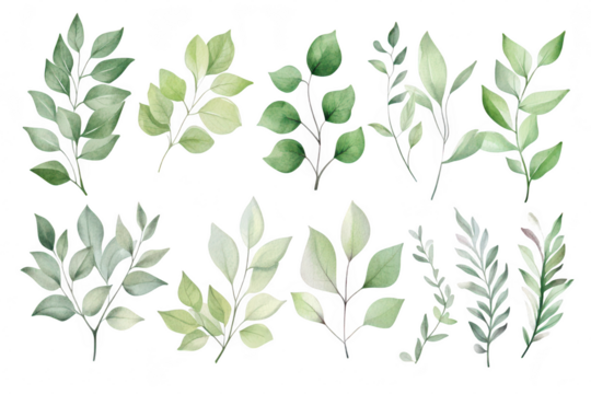 A collection of various green leaves different shapes and sizes. arranged artistically on a white background. ideal for nature-themed designs or botanical illustrations