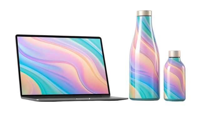 Laptop computer with abstract colorful screen and matching water bottles mockup showcasing modern technology and hydration solutions