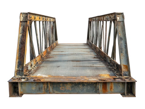a weathered. rusted metal bridge with a flat surface and triangular supports. suggesting it is an old pedestrian or vehicle crossing its worn appearance indicates it may be in disrepair or rarely used