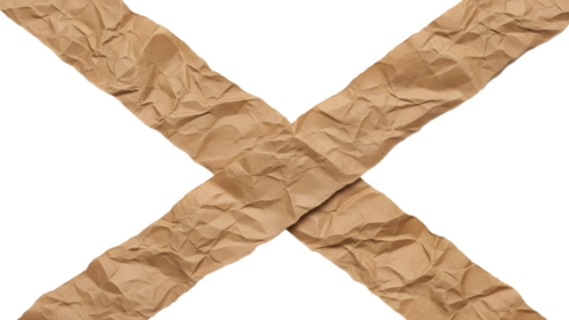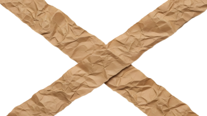 Two Crumpled Brown Paper Strips Forming an X Shape isolated on a transparent background crumpled paper