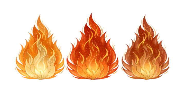 Three flame illustrations in different shades of orange and red isolated on transparent background