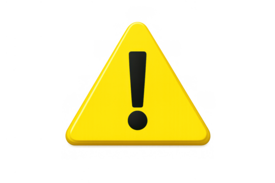 Yellow warning triangle sign with a black exclamation mark on a transparent background, symbolizing caution, risk, error, and security
