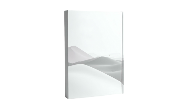 A canvas print depicts layered, soft desert dunes in grayscale, framed with a white border