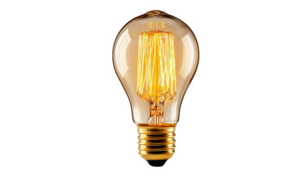 A lightbulb with an internal spiral filament, glass, and brass base on a black background