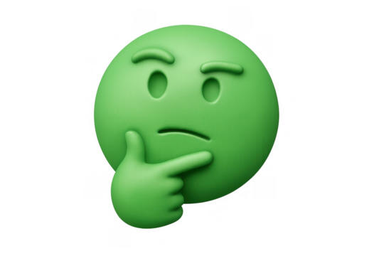 Green 3d emoji contemplating a decision, considering options, feeling doubtful, skeptical, or having a question, transparent background
