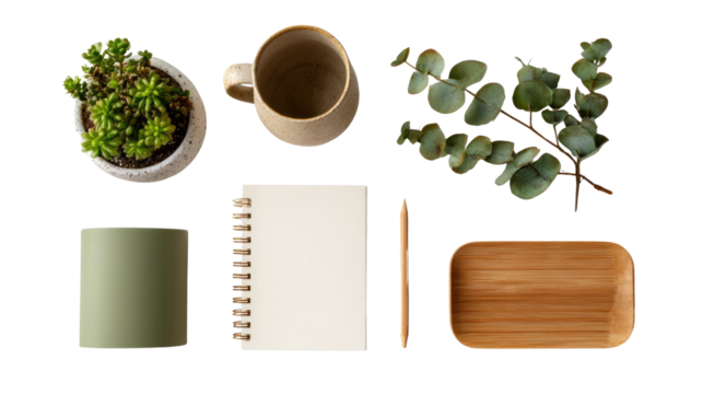 Still Life Collection: An overhead shot showcases a carefully arranged assortment of natural elements, including a potted succulent, a ceramic mug, eucalyptus branches, a cylindrical container.