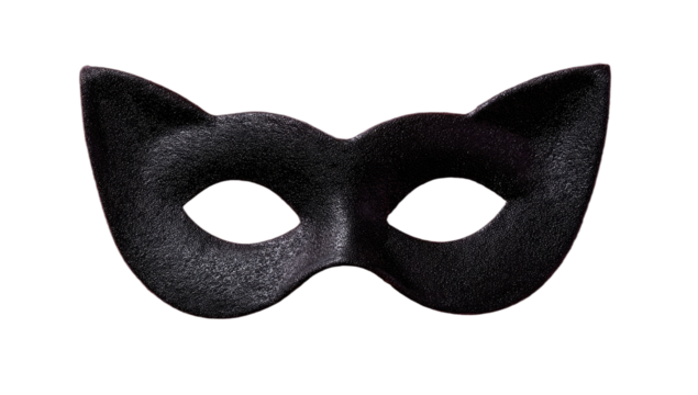 A black, furry, cat-eared mask with eye cutouts, set against a black background