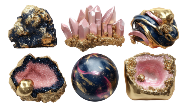 Unique Mineral Artifacts with Gold Accents on Isolated Transparent Background