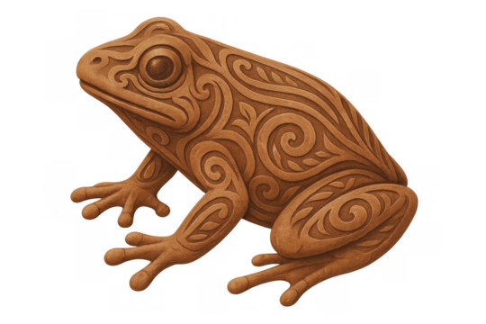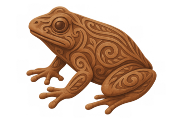 Wood carving frog sculpture with ornate patterns