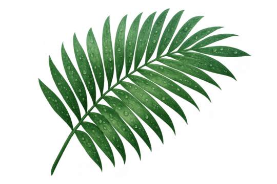 Tropical palm frond with glossy water drops, fresh green foliage for summer, nature, and botanical designs, transparent background