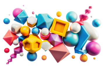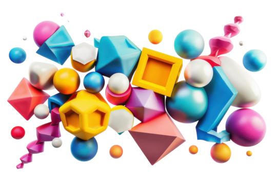 Colorful abstract arrangement of geometric shapes and spheres in vibrant hues and dynamic forms isolated on transparent background