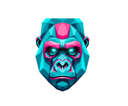 Stylized low poly gorilla head with neon pink and blue colors isolated on transparent background