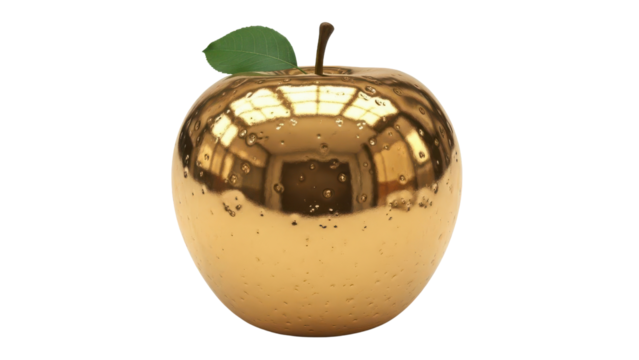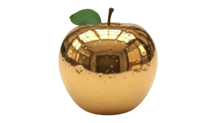 Shiny Golden Apple 3D Render with Green Leaf and Stem isolated PNG with Transparent Background
