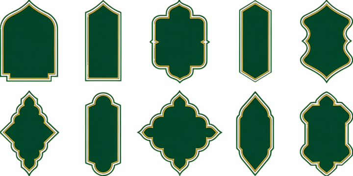 Green and gold Islamic geometric shapes on white background isolated on a transparent background