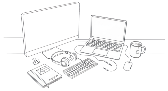 overhead view of modern workspace (monitor, laptop, keyboard, headphones, mug) in continuous black line art on a transparent background with copy space, concept of focused productivity