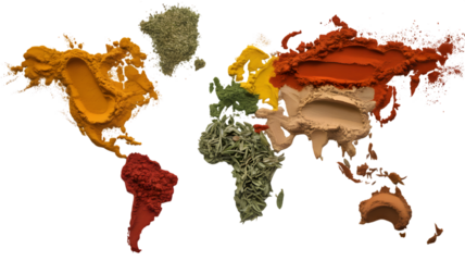 World map made of colorful spices on black background
