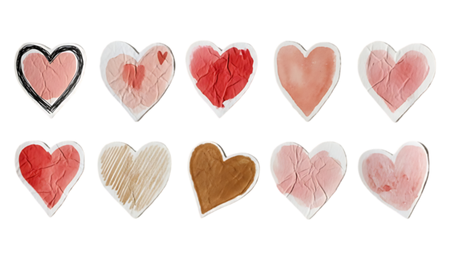 A beautiful collection of diverse heart shapes and textures perfect for designs on transparent background