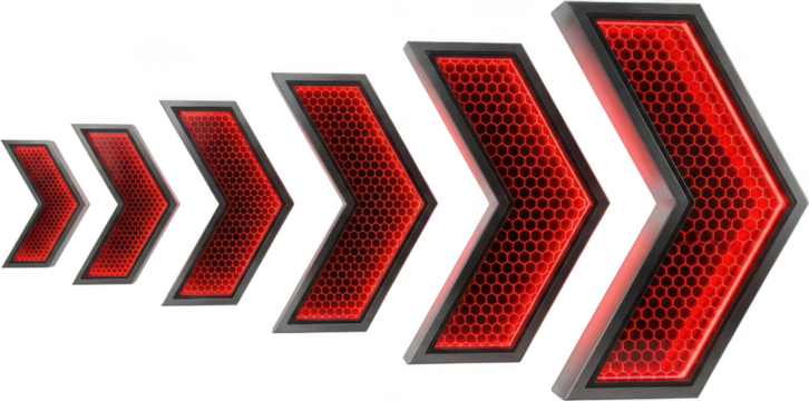 A progression of six metallic arrows filled with glowing red honeycomb patterns indicating forward movement and growth digital graphic direction shiny modern abstract design transparent background