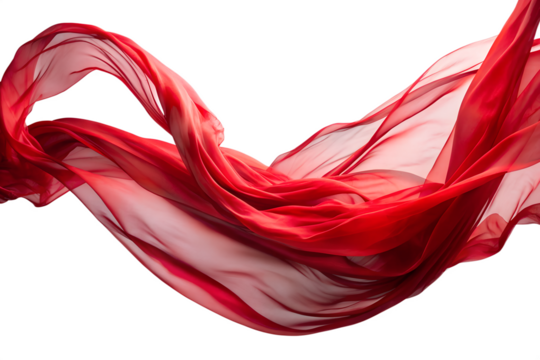 A flowing wave of sheer red silk fabric isolated on a transparent background