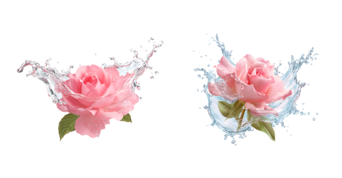 Beautiful Pink Rose Flower Surrounded by a Refreshing Water Splash on a transparent background