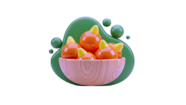 3D Rendering of Candy Corn in a Wooden Bowl with Green Abstract Shapes