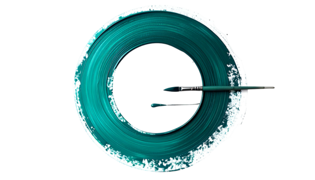 Teal paint swirl forms a circle; brushstrokes extend. Black background, white border