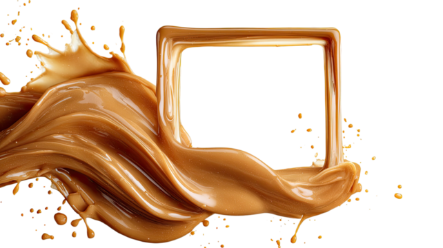 A dynamic splash of caramel sauce forming a swirling wave shape