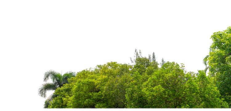 Group green tree isolate on transparent background. png file. Cutout tree line. Row of green trees and shrubs in summer isolated on white background. ForestScene. Forest and green foliage.