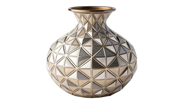 Elegant geometric faceted metallic vase featuring a sophisticated reflective mosaic pattern on transparent background