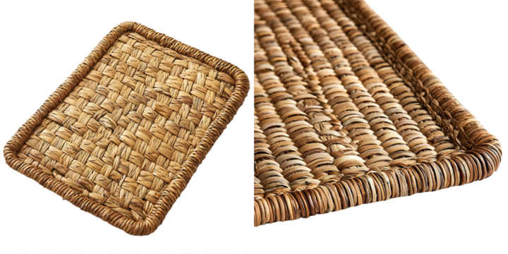 Rectangular woven rattan mat with a braided edge isolated on a transparent background.