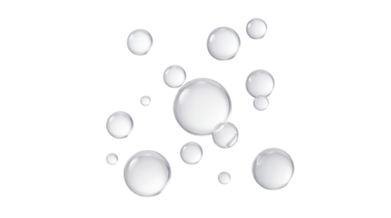 Close-up of a collection of shiny, reflective, and transparent water droplets, isolated on white.