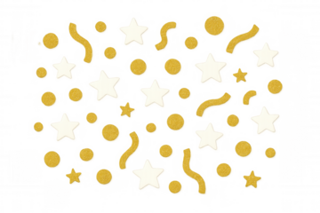 Sparkling gold and white confetti raining down, adding festive elegance against transparent backdrop for event graphics