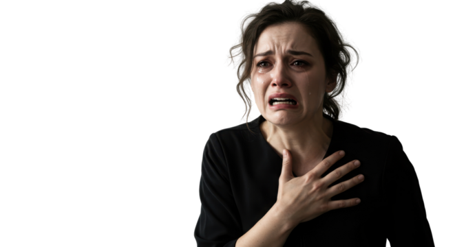 Distressed woman crying and clutching chest on white background