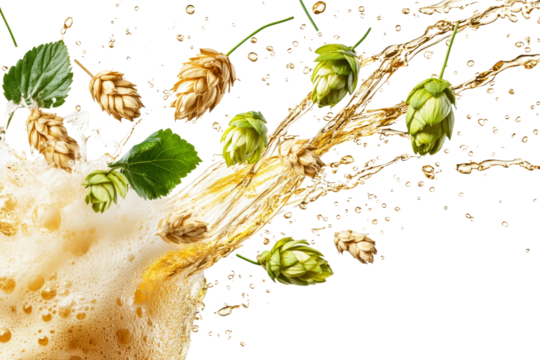 A refreshing splash of beer with hops and leaves, showcasing the natural ingredients of brewing in a vibrant and dynamic manner.