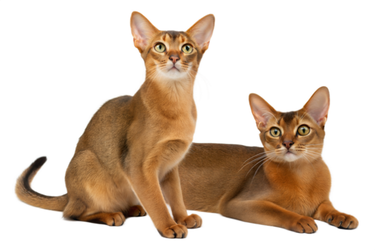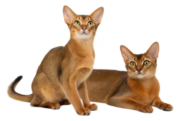 Two adult Abyssinian cats isolated on a white background. Studio photo.