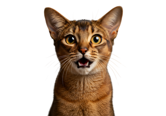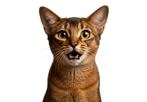 Full body shot of Abyssinian Cat cat yawning. Transparent, white background, isolated.