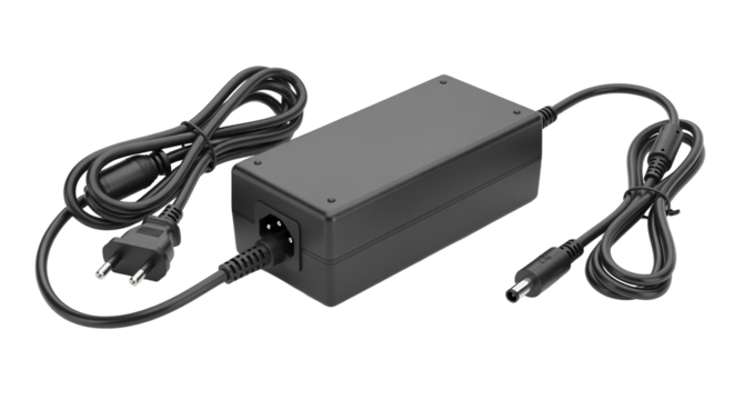 black wire cord with two round pins power plug or europlug isolated white background, side view of electrical cable used in low power devices