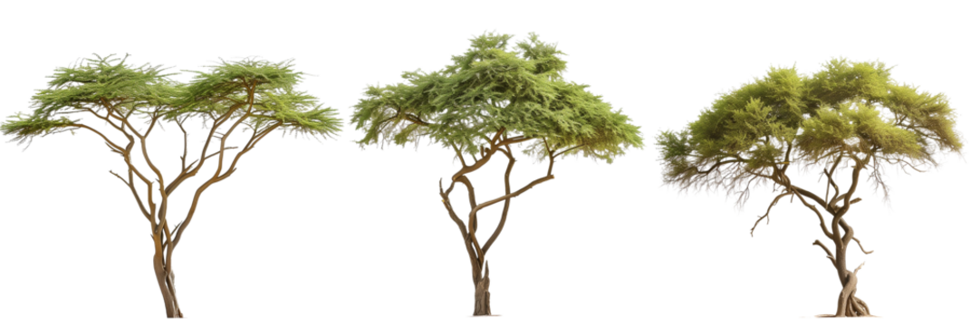 Collection of three African acacia trees isolated on transparent background