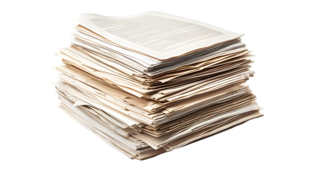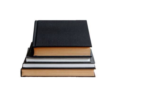 A black graduation cap rests atop a stack of colorful academic books isolated on transparent background