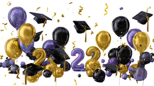2022 graduation celebration with gold black balloons confetti and graduation caps festive party scene on white background