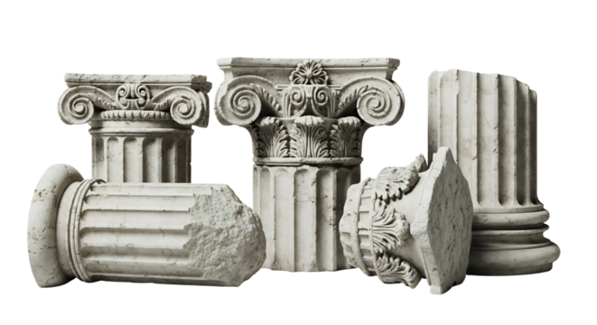 Classical Greek and Roman architectural columns, broken and upright, isolated on white & transparent background. Ideal for historical studies, legal branding, educational content,